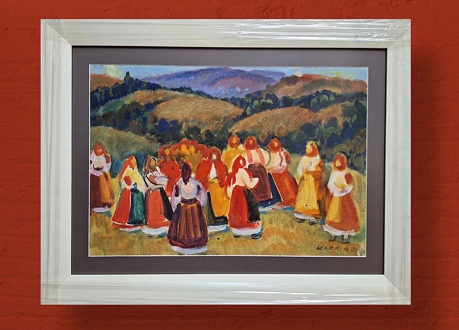 Картина Антона Шепи передає атмосферу українського села, зображуючи жінок у яскравому народному вбранні серед мальовничих пагорбів. Художник майстерно використовує акварель, що надає зображенню м’якості й теплоти. Яскраві кольори створюють відчуття радості та єдності.